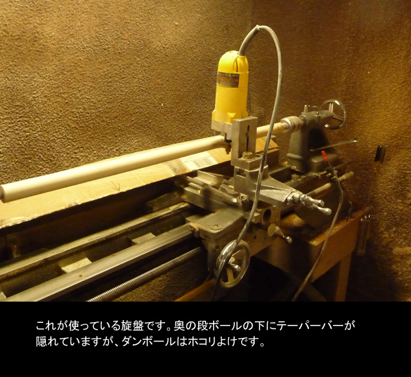 旋盤にガイドになるメタルかハードプラスチックのテーパーバーと呼ばれるものをつけます。これは調べたところかなり昔から使われていたようで、1970年頃にはTadさんも使っていた、とどこかに載っていましたね。