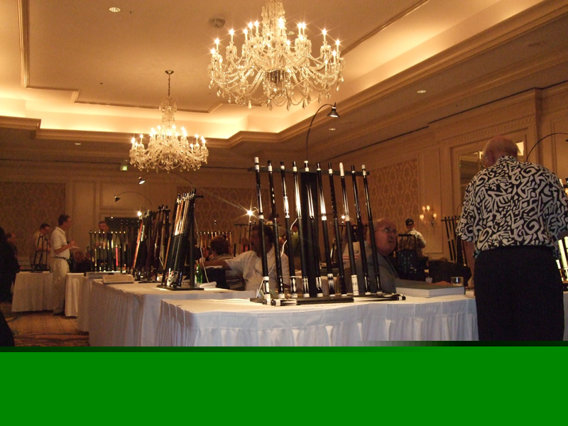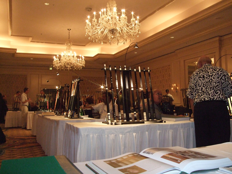 また、展示ブースにはこの他に、10数人のコレクターがそれぞれにこだわりのあるキューをずらりと持参して『どうだ!』とばかりに飾ってありました。みな、気合が入ってすごいものばかりです。